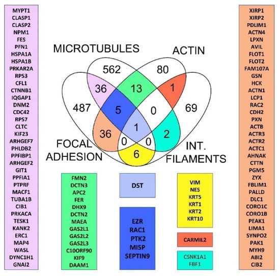 The list of proteins linking integrin-related adhesion complexes (IACs) to intermediate filaments, microtubules, and the actin cytoskeleton is described in Supplementary Table S1 (Sheets 1–4). The preliminary dataset containing the list of proteins (Supplementary Table S1) was defined using the online gene ontology tool QuickGO []. When using an interactive search tool for genes and gene products, the following conditions were set: (a) taxon: Homo sapiens (9606); (b) gene products: proteins; (c) references: any Pubmed; (d) evidence: experimental evidence used in manual assertion (ECO:0000269), including its Child terms. Furthermore, the following GO terms were used: “actin cytoskeleton (GO:0015629)”, “microtubule cytoskeleton (GO:0015630)”, “intermediate filament cytoskeleton (GO:0045111)”, and “focal adhesion (GO:0005925)”. QuickGO database was assessed in November 2021 to retrieve human cytoskeletal proteins. Furthermore, obtained datasets were curated according to the published datasets. Briefly, the Intermediate filament dataset is expanded with the proteins from the Human Intermediate Filament database []. The microtubule dataset is enriched by proteins curated in the literature [,,]. In addition to the QuickGO dataset, the FA list is defined by adding the proteins from the literature curated dataset [] and the consensus adhesome proteins []. In addition, recent datasets obtained on long-term cultured cells were compared with the meta-adhesome [], while the matched proteins were added to the focal adhesion dataset [,,,]. Overall, the dataset contains the proteins responsible for integrin-mediated signalling and focal adhesions to microtubules, actin filaments, and intermediate filaments. The intersections of the generated protein datasets were performed using the Venn diagram online tool Venny (2.1.0 software version) [].