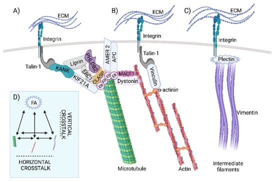 Schematic representation of vertical and horizontal crosstalk. (A) After binding to ECM proteins, the signal is transduced to focal adhesions via integrins. Proteins of the cortical microtubule stabilization complex (liprins, ERC1, PHLDB2, CLASPs, AMER2, and APC) play an important role in force transmission to microtubules, while direct binding of KANK to talin-1 and KIF21A contributes to microtubule recruitment to the outer rim of focal adhesions. (B) Force transmission to actin filaments is facilitated by the binding of talin-1 to cytoplasmic integrin tails that recruit mediators such as vinculin and actinin alpha and help to transduce the signal to actin filaments. (C) ECM-integrin-mediated force transmission to intermediate filaments is facilitated by binding of the β4-subunit and plectin, whereas depletion of vimentin blocks β4-enhanced invasion. In addition, binding of plectin to the β4 subunit is responsible for recruitment to focal adhesions and cell spreading. (D) Simplified scheme of vertical and horizontal crosstalk.