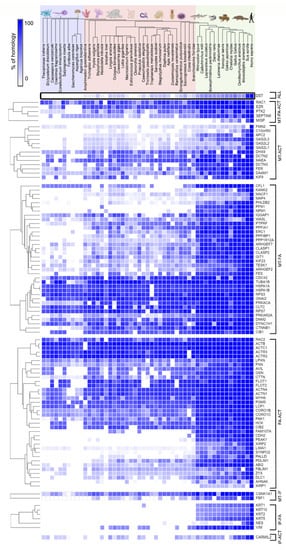 To obtain a general overview on the evolution of the obtained crosstalk proteins, we searched for the closest homologs in our organism dataset using human crosstalk proteins as queries with the BLAST2GO tool. The results of this analysis revealed dynamic evolutionary patterns within different cytoskeletal intersections (Figure 3). As expected, most vertebrate proteins (from Rhinocodon typus to Homo sapiens, green rectangle) show a high percentage of similarity to human homologs, while many corresponding homologs show lower similarity to proteins from amoebae, unicellular opisthokonts, and fungi (organisms in the purple rectangle, from T. trahens to Agaricus bisporus).