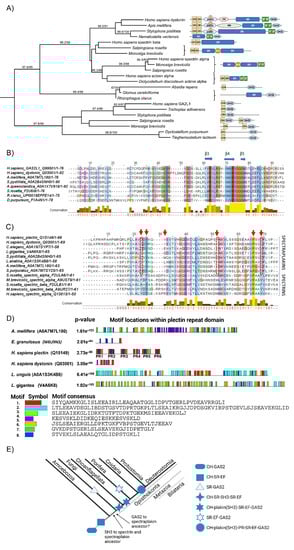 The spectrin repeat (SR) is the second feature of spectraplakins and consists of approximately 100–115 amino acids that can form three α-helices. The spectrin motif is also an ancient evolutionary invention [], and we detected it outside of Amorphea; however, it is usually present as a single domain outside of this clade. Ancestral actinin probably had two spectrin repeats, corresponding to SR1 and SR4 in modern actinin alpha []. Spectrin proteins evolved from an actinin ancestor through multiple intragenic duplications of spectrin repeats and serve as crosslinking molecules between actin filaments and integral membrane proteins []. Previous studies have shown that SR1 of actinin corresponds to SR1 in spectrin beta, whereas the last SR in spectrin alpha corresponds to SR4 of actinin, indicating a split in ancestral spectrin []. We were unable to discover spectrin homologs outside the Opisthokonta group using BLAST or SMART, HMMER, or InterPro-conserved domain search. However, we have found highly conserved spectrin homologs in the plant Rhodamnia argentea that were also experimentally characterized recently. Nevertheless, the authors had no explanation for the presence of this protein in the single plant species []. Within the unicellular opisthokonts, both spectrin types, alpha and beta were previously identified in the Choanoflagellata Monosiga brevicolis []. In addition, we have found both spectrins in another Choanoflagellata, Salpingoeca rosetta. Phylogenetic analysis placed all analysed spectrins in a strongly supported clade (Figure 4A), together with actinins alpha, confirming previous studies on the phylogenetic relationships of these two proteins.