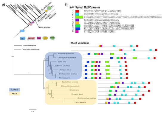 Among obtained proteins found at the intersections, five proteins emerged as players in interaction between focal adhesions, microtubules, and actin filaments: FAK, RAC1, septin 9, MISP, and ezrin. Homologs to some of these proteins were previously found in distantly related organisms. Based on these studies, we conclude a likely evolutionary origin of the specific protein found in the triple intersection in our study (Figure 5A). Rac1 was identified in Amoebozoa [], and is highly conserved with 91% sequence identity to human RAC1. Direct FAK and septin homologs have been found in unicellular opisthokonts []. In addition, septins are known to be involved in many cellular processes in Fungi and Metazoa []. In contrast, ezrin appears to be specific to vertebrates. However, ERM family paralogs are highly conserved among themselves (about 75% sequence identity in human ERM proteins) and the ERM domain itself also originates in unicellular opisthokonts []. This suggests that early ERM domain proteins likely serve similar functions and have similar interaction partners as human ezrin. Finally, MISP appears to be specific to vertebrates. Previously, MISP was identified as homolog to proteins of AKAP family []. In addition, vertebrates possess another MISP homolog, named MISP3. Human MISP and AKAP2 share a conserved C-terminal domain (Figure 5B). However, these proteins are poorly characterized, especially with respect to the binding domains. Interestingly, the human MISP protein is only 62% identical to the mouse and porcine proteins. BLAST hits obtained using human MISP as a search query did not return MISP homolog in Chondrichthyes R. typus and C. milli, present in our organism dataset. However, when BLAST was performed against all Chondrichthyes, direct MISP homologs were found in two species (Scyliorhinus canicula and Chiloscyllium punctatum), which was further confirmed by reciprocal BLAST, suggesting that the MISP homolog was present at the base of Vertebrata evolution. Outside Vertebrata, we detected homologs of AKAP2 only in Tunicata species. Distant homologs have been observed previously []; however, they have low overall homology with human proteins and generally with MISPs from Vertebrata.