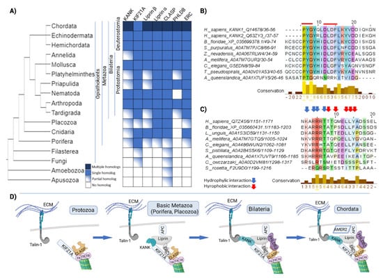 Processes such as the evolution of movement (flagella and cilia in unicellular organisms) and the development of multicellularity, differentiation, and complex movements, as well as the precise segregation of large amounts of genetic information, make the evolution of the cytoskeleton one of the prerequisites for the emergence of highly complex genomes []. Therefore, communication between cytoskeletal filaments is one of the key topics for understanding the above functions. Among the proteins linking MTs and FAs, we found many proteins belonging to the cortical microtubule stabilisation complex (CMSC) (Supplementary Table S1, Sheet 8). These complexes are linked to FA via KANK proteins []. KANK proteins are important regulators of the crosstalk between MTs and FAs and as such represent good candidates for analysis of the evolution of the MT-FA axis. In addition, previous studies have identified interaction motifs with both KIF21 at MT side and talin at FA side. Both KANK1 and KANK2 can bind talin via the KN motif [,] and KIF21A via the ankyrin domain []. Structural analysis by Bouchet et al. showed that the KN domain of KANK1 binds to the talin rod domain R7 []. A single mutation in talin abolishes the binding of KANK1, suggesting that the interaction between talin-1 and KANK1 plays an important role in the association processes between the outer rim of FAs and MTs. At the C-terminus of the KANK protein, ANK repeats are responsible for binding to KIF21A. KANK1 recruits KIF21A to control MT growth, while on the other hand, KIF21A affects the translocation of KANK1 to the plasma membrane []. In addition to its role as a cortical MT growth inhibitor, KIF21A contributes to the formation of overlapping clusters that include PPFIA1 (liprin α1), PPFIBP1 (liprin β1), and PHLDB2 (also known as LL5β) at the cell cortex []. MT localization at the cortical site is regulated by plus-end tracking proteins such as CLASPs by forming a complex with ERC1 and PHLDB2, while the N-terminus of liprin β1 has been shown to be responsible for binding to the KANK proteins [,].