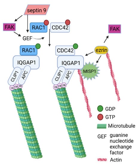 Finally, five proteins emerged as possible players in crosstalk between FAs, MTs and actin filaments: FAK, RAC1, ezrin, septin 9, and MISP. Here we propose the mechanism that includes all proteins found at the intersections of three datasets (Figure 7). FAK has been known to play the main role in cytoskeleton remodelling, participating in many processes including the regulation of Rho-family GTPases (CDC42, and RAC1) []. Another member of cytoskeletal proteins with GTP-ase activity, septin 9 has been shown to regulate cytoskeletal processes through FAK/Src/paxillin signalling pathway []. In addition, knockdown of septin 9 decreases the levels of CDC42, RhoA, and RAC, which are important members in the activation of IQGAP, a scaffold protein found at the intersection of FAs and MTs that plays a key role in regulating cell motility processes. Ezrin, another protein detected at the intersections of FAs, MTs, and actin filaments, directly binds IQGAP and affects its cortical localization []. In addition, Vodicska et al. showed that MISP interacts directly with terminal part of IQGAP, enabling the binding of MISP to CDC42 through IQGAP []. They also showed that MISP knockdown promotes cortical accumulation of IQGAP, and IQGAP mediated CDC42 deactivation. IQGAP is responsible for the capturing of the astral MTs to the cell cortex, in collaboration with CLIP1 (also known as Clip-170) or APC. Activated CDC42 and RAC1 are key regulators of cell polarization that orchestrate the crosstalk between actin and MTs by activating IQGAP, through formation of a ternary complex with APC. When bound together, this complex possesses the ability to bind CLIP1, attaching to the plus-end of the microtubules via its interaction with EB proteins [,,].