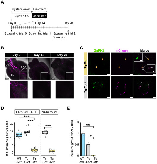 GnRH3 neuronal ablation is validated in the brain at 28 days of treatment. (A) Treatment and analysis schedule. Fish were exposed to 2 mM Mtz daily during the dark phase for 28 days, and were sampled at 14 and 28 days into the treatment. (B) Top panel: confocal images of GnRH3 neurons expressing NTR-mCherry fusion protein (magenta) in whole brains from the Tg(gnrh3:Gal4ff; UAS:nfsb-mCherry) fish before the treatment, and at 14 and 28 days of treatment. Bottom panel: POA-zoomed images showing the boxed area from the top images. Scale bars, 200 µm. (C) Confocal images of co-immunostaining of GnRH3-associated peptide (green) and mCherry (magenta) in the whole brain of Tg-Mtz (top panels) and Tg-Cont (bottom panels) at 28 days of treatment. GnRH3 neuron cell bodies co-localized with mCherry in Tg-Mtz are labeled by arrowheads. Scale bars, 100 µm. Insets, zoomed images of GnRH3-ir and mCherry-ir neuron cell bodies co-localization showing the boxed areas of the merged image in Tg-Mtz. Scale bars, 10 µm. (D) Numbers of GnRH3-positive cells (left) and mCherry-positive cells (right) in the POA (n = 6–7). (E) Relative gnrh3 mRNA levels in the whole brain (n = 4 each). OB, olfactory bulb; TL, telencephalon; POA, preoptic area; ir, immunoreactive; WT-Mtz, WT siblings treated with 2 mM metronidazole (Mtz); Tg-Cont, Tg(gnrh3:Gal4ff; UAS:nfsb-mCherry) treated with vehicle; Tg-Mtz, Tg(gnrh3:Gal4ff; UAS:nfsb-mCherry) treated with 2 mM Mtz. *, p < 0.05; **, p < 0.01; ***, p < 0.001.