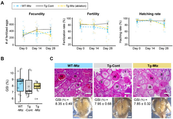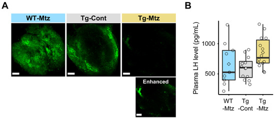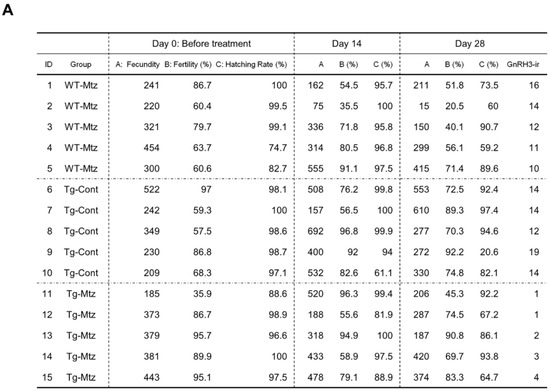 To determine whether GnRH3 neuron ablation affects LH secretion from the pituitary, we measured plasma LH levels using a specific ELISA for LH after spawning at 28 days of treatment. Plasma LH levels of GnRH3 neuron-ablated females (Tg-Mtz) were unchanged compared to those of the control females (Tg-Cont and WT-Mtz; p = 0.6) (Figure 2B), which ranged from 215 to 1323 pg/mL.
