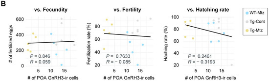 To investigate the effect of GnRH3 neuronal ablation on spawning and fertility, we evaluated reproductive characteristics in each group at 14 and 28 days of treatment by allowing each experimental female to mate with a WT male counterpart. The first observation was that all females spawned within the allocated time. There was no significant difference in the number of fertilized eggs (fecundity), fertilization rate, or hatching rate between the three treatment groups during each trial (p = 0.489 for the number of fertilized eggs; p = 0.161 for fertilization rate; p = 0.456 for the hatching rate) (Figure 3A). Further, there was no difference in the gonadosomatic index (GSI) between the three treatment groups after spawning at 28 days of treatment (p = 0.9) (Figure 3B). The ovaries of GnRH3 neuron-ablated females (Tg-Mtz) possessed normal oocytes at all stages of development, and were undistinguishable from those of the two control groups (Tg-Cont and WT-Mtz) (Figure 3C). Importantly, no correlation was observed between the number of POA GnRH3-ir neurons and each reproductive assessment parameter at 28 days of treatment: fecundity (p = 0.846, R = 0.059), fertility (p = 0.7633, R = −0.085), and hatching rate (p = 0.2461, R = −0.3193) (Figure 4). This indicates that female fish with 1−2 detectable GnRH3 neurons in the POA performed similarly to the those with 16 and 19 neurons (Figure 4).
