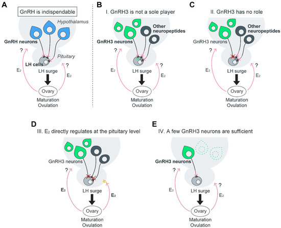 Schematic diagram of the different possible pathways in inducing the pre-ovulatory LH surge along the HPG axis in female zebrafish. In general, the accepted dogma is that the hypophysiotropic GnRH and its neurons are critical for LH surge, and ultimately oocyte maturation, ovulation, and spawning (A). Our current results suggest that GnRH3 neuron-ablated zebrafish females display normal fertility, and previous studies suggest four alternative pathways (B–E): I. Hypophysiotropic GnRH3 has no role, but other brain factors (e.g., vasoactive intestinal peptide, kisspeptin, neurokinin B, and secretoneurin) trigger LH surge (B); II. Functional redundancy—GnRH3 has a role, but is not the sole and only player, thus sharing this function with other factors (C); III. Ovarian estradiol-17b (E2) directly induces the LH surge and controls ovulation (D); IV. In GnRH3 neuron-ablated females, a few remaining hypophysiotropic GnRH3 neurons are possibly sufficient to elicit LH surge (E). The question marks indicate that these pathways remain to be established in zebrafish.