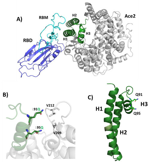 An analysis of the structure of SARS-CoV-2 complex with ACE2, reveals that most hydrogen bonds between the spike protein and ACE2 involve the helix H1 (residues 20–52) and the C-terminal part of helix H2 (residues 56–82) of ACE2 [17]. Starting from the region H1-H2 of ACE2 as a basic scaffold for the design of a spike interactor, we included several mutations to increase its stability and solubility, with the aim to compensate for the missing interactions that are mediated by residues outside helices H1 and H2. To stabilise this scaffold, we included an extra helix, H3 (residues 91–101) which naturally caps helices H1 and H2 in the ACE2 structure, through a cluster of hydrophobic interactions involving Val92, Leu97, and Leu100 of H3; Phe28, Leu29, and Phe32 of H1; and Ala80 of H2, holding together the two helices, H1 and H2 (Figure 1). We further engineered this variant by including two mutations, Leu91 to Gln and Leu95 to Gln, to improve protein solubility by replacing hydrophobic with hydrophilic residues, and hamper aggregation in solution. In ACE2, these two residues are located on the opposite side of the S-binding region and form hydrophobic interactions with the core of ACE2 to stabilise it (Figure 1B,C). Their mutation to glutamine residues was also motivated by the characteristics of glutamine to further stabilise α-helix structures.