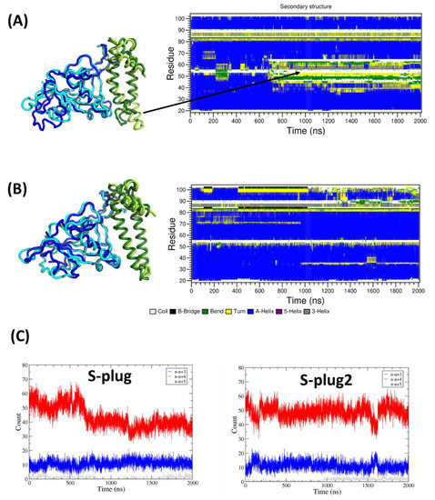 Molecular dynamics (MD) studies. (A,B) Secondary structure time evolution of S-plug and S-plug2, respectively, in the MD simulations complexes; best superimposition of the starting and average structures of the trajectories are reported on the left panels; RBD is shown in cyan/blue, S-plugs in yellow/green (starting/average); average structures (on Cα atoms) are computed over the entire trajectories. (C) Evolution of the number of hydrogen bonds in helical conformation in S-plug (left) and S-plug2 (right).