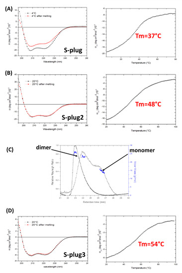 Designed miniproteins were successfully over-expressed in E. coli, resulting in high yields of pure proteins. Far-UV CD spectroscopy spectra of S-plug and S-plug2 are typical of well-structured folds with high α-helical content, with typical minima at 208 and 222 nm (Figure 3). Spectra also show that folding is fully reversible, with the CD spectrum after refolding fully superimposable to that recorded at 20 °C (Figure 3A). To investigate the heat-induced changes in the protein secondary structure, thermal unfolding curves were recorded by following the CD signal at 222 nm as a function of temperature, using a 1 °C/min heating rate. Thermal unfolding curves of S-plug and S-plug2 exhibit the characteristic sigmoidal profile expected of two-state systems (Figure 3A,B). Consistent with MD computations, S-plug2 displays a thermo-stabilised structure, with an increase in the melting temperature (Tm) from 37 °C of S-plug to 48 °C (Figure 3A,B).