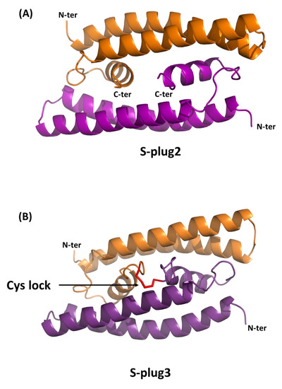 Cartoon representations of S-plug2 (A) and S-plug3 (B) models obtained using Rosetta docking procedures [19]. The C-terminal arm (PGGC) inserted in S-plug3 to induce a disulphide bond (B) is drawn in red ribbon representation.