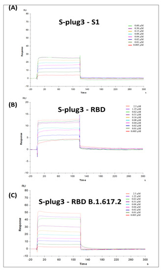 Surface plasmon resonance (SPR) analysis. Sensorgrams to evaluate the binding affinity between S-plug3 and (A) spike S1 domain, (B) spike RBD, (C) spike RBD B.1.617.2 (delta) variant.