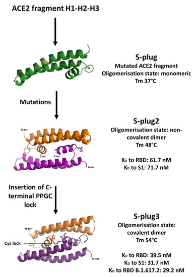 Based on the available structural information of the spike–ACE2 complex, we developed miniproteins which embed key spike-interacting residues in the ACE2 receptor. After the development of our prototype miniprotein spike binder, S-plug [28], one study reported the development of other miniproteins binding to the spike with high affinity; the best ranking showed low nanomolar binding affinity and was based on large-scale de novo design [29]. We started from our prototype S-plug [28], containing H1-H2 and H3 helices of ACE2, with mutations on the H3 helix (L91Q and L95Q) to improve its solubility (Figure 1). Then, our protein-engineering goal was to identify thermo-stabilising mutations located in regions that do not interact with the spike protein, to preserve its binding mode. The rationale of this study is to generate spike interactors that resemble the human ACE2 receptor, as we expect that such molecules would recognise all known coronaviruses accessing the host through this receptor, such as SARS-CoV, HCoV-NL63, as well as other coronaviruses that may emerge in the future.