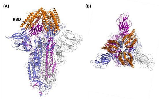 Cartoon representation of the spike trimer (closed conformation) in complex with S-plug3. The positions of S-plug3 molecules (orange) on the spike protein were determined upon superposition of RBD of our minimised S-plug3–RBD complex on the RBD of the entire S protein (pdb code 6m0j). (A,B) panels report side and top views, respectively.