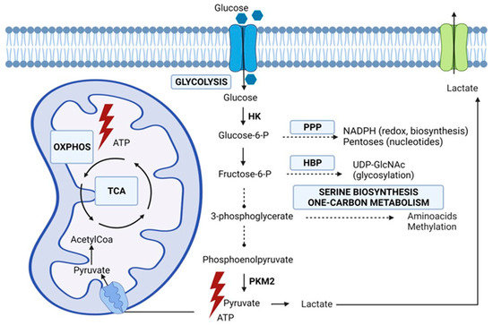 Glucose metabolic pathways emanating from glycolysis involved in lung cancer cell metabolism. HBP (hexosamine biosynthesis), HK (hexokinase), OXPHOS (oxidative phosphorylation), PKM2 (pyruvate kinase isoform M2), PPP (pentose phosphate pathway), TCA (tricarboxylic acid) cycle. Original figure drawn with Biorender.