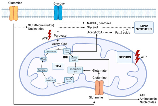 A principal nutrient other than glucose, but required by proliferating cells, is glutamine, the most abundant amino acid in the human blood. As an alternative carbon source, glutamine supplies the growing cell with carbon intermediates to support energy generation and the accumulation of building blocks [30]. Furthermore, as illustrated in Figure 2, glutamine catabolism, i.e., glutaminolysis, provides nitrogen for the biosynthesis of purines, and glutamine-derived carbons synthesize pyrimidines and non-essential amino acids. In addition, glutamine-derived glutamate is a component of the main antioxidant factor glutathione, and glutamine stimulates the expression of uncoupling protein 2 (UCP2) in the mitochondrial membrane and thereby regulates substrate oxidation in the mitochondria [31,32].