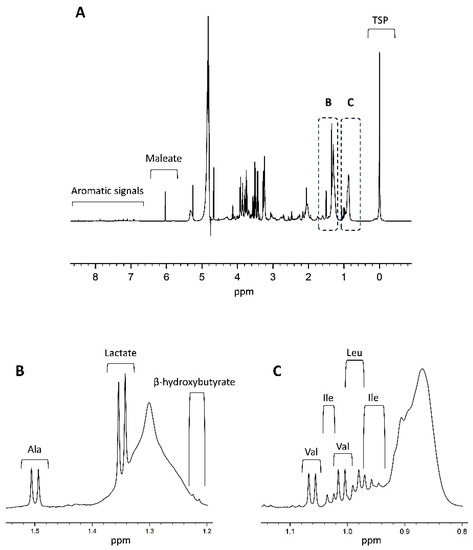 (A) Shown is a 600 MHz plasma 1H-NMR spectrum of a healthy control, adapted from Ref. [49]. A complete overview of all signals assignments based on spiking experiments can be found in Derveaux et al. [49]. As shown in the figure, the chemical shift values are quoted in ppm and depend on the individual chemical environment of the metabolite’s hydrogen atom. The integrated area under the peak is proportional to the number of hydrogens and thus the metabolite’s concentration. TSP is added as a competitive binder of human serum albumin and ensures dissociation of albumin-bound metabolites. Together with TSP, a fixed concentration of maleate (with a sharp signal around 6 ppm) is added as a reliable internal standard to quantify the human plasma metabolites. Parts (B,C) zoom in on the 1.2–1.5 ppm and 0.8–1.1 ppm regions of the spectrum, respectively. Clear signals of lactate, alanine, valine, leucine, and isoleucine are highlighted as an example. As shown in (B), alanine has a sharp non-overlapping doublet signal (1.5 ppm) that represents its methyl group and efficiently serves as an internal chemical shift reference. Ala: alanine; Ile: isoleucine; Leu: leucine; Val: valine.