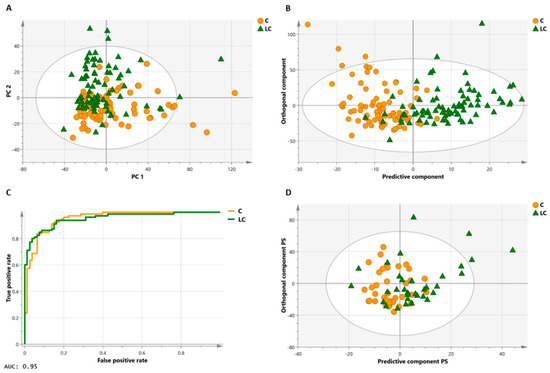 The outcome of a multivariate analysis provides an overview of the metabolites (variables) that are affected by the disease and thus have the potential to differentiate the study subjects. Pattern recognition and related multivariate statistical techniques, such as shown in Figure 4 for PCA and OPLS-DA, are applied to detect relevant patterns and to identify metabolic signatures having diagnostic or prognostic value [59,60].