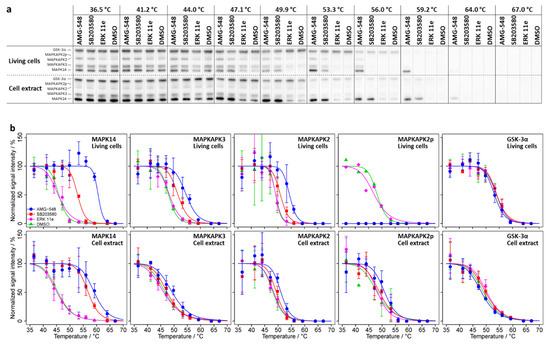 2.2 μL, respectively, of the same 10 mM stock solutions of the three kinase inhibitors AMG-548, SB203580, and ERK 11e in DMSO, used for treatment of living cells, were added to three of the 1.1 mL aliquots of 1.8 mg/mL HL-60 cell extract. A fourth aliquot of 1.8 mg/mL HL-60 cell extract was supplemented with 2.2 µL of DMSO. After mixing and incubation (1 h, 37 °C), the four extracts were distributed into 100 µL each in PCR tube strips, so that the samples to be compared were placed together in one strip (10× strips of 4 PCR tubes: AMG-548, SB203580, ERK 11e, and DMSO control). After a brief centrifugation using a benchtop centrifuge, the temperature treatment at the ten different temperatures was performed as described in Section 4.1.1.