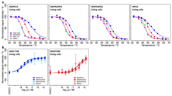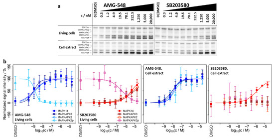 From our perspective, the most interesting finding was that MAPK14 and its substrates MAPKAPK2/3 exhibit a high similarity in pEC50 values and dose–response characteristics upon treatment of living cells with AMG-548 (pEC50 = 8.9 ± 0.2, 9.0 ± 0.2, 8.8 ± 0.2, 8.8 ± 0.1 for MAPK14, MAPKAPK3, MAPKAPK2, and MAPKAPK2p, respectively) and SB203580 (pEC50 = 5.3 ± 0.1, 5.0 ± 0.3, 5.2 ± 0.2, 6.4 ± 0.2, respectively), as well as for AMG-548 in cell extracts (pEC50 = 7.9 ± 0.1, 8.1 ± 0.1, 8.0 ± 0.2, 7.8 ± 0.2, respectively) (Figure 2b and Table 2). For SB203580 in the cell extract, binding characteristics were only accessible for MAPK14 due to the lack of significant changes in melting behavior for MAPKAPK2/3, which was already observed in the melting curves (see Section 2.1.2). For the same reason, the negative control inhibitor ERK 11e did not cause dose–responses for the assayed proteins and conditions (Supplementary Figure S3).