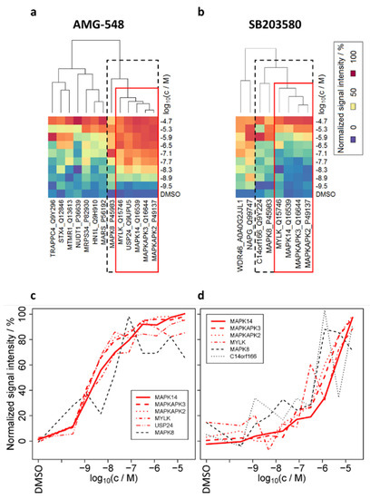 Heat maps after cluster analysis of the filtered (acceptable fit of dose–response curves for stabilized proteins, see experimental section for filter criteria) dose–responses (mean over replicates), derived from TPP-CCR experiments in living cells. (a) AMG-548, (b) SB203580. Narrower and wider clusters around the primary target MAPK14 are represented by red and dashed boxes, respectively. See Supplementary Figure S4 for the same representation for ERK 11e. Plots (c,d) show the normalized signal intensities of the proteins highlighted by the red and dashed boxes in (a,b), respectively, which are plotted in two dimensions instead of color-coded.