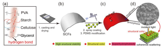 In this study, a kind of biomimetic robust SCFs with super-hydrophobicity and excellent structural stability was prepared successfully. The potato starch (PS) and polyvinyl alcohol (PVA) were chosen as base material. Cellulose fibers (CFs) were chosen as cost saving reinforcements to build skeleton inner the SCFs (Figure 1a,b). A vast amount of hydroxyl in starch, cellulose fibers, and PVA molecules facilitated the formation of intra- and intermolecular hydrogen bonds, favoring the combination among starch, cellulose fibers and PVA. So, the structural stability (tensile strength and elongation at break) of the Starch/PVA/fiber composite film (SPF film, prepared by casting method) had been improved significantly. Bioinspired by the Lotus effect and the structural colors in natural world, bifunctional layer with nano-roughness and colloidal amorphous arrays was constructed by spraying the silicon dioxide (SiO2) monodispersed nanoparticles on the surface of SCFs (Figure 1c). The SPF film reached super-hydrophobic state assisted by coating a layer with low surface energy material polydimethylsiloxane (PDMS). At the same time, the SPF film was colored by SiO2 colloidal crystals with different diameters and the color was produced by the interaction between the coherent scattered light and the amorphous arrays (Figure 1d). The work would offer a new pathway for the SCFs’ practical applications.