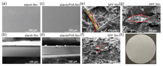 Figure 2 shows the SEM images of SPF film and other films. There are no pores and flaws on the surface of the pure starch film and starch-PVA composite films (SEM images in Figure 2a,c), and the cross-sectional structures of both films were neat and smooth (Figure 2b,d) which demonstrated the excellent compatibility between starch and PVA. In the case of starch-PVA-fiber composite film, fibers are evenly distributed in the starch-PVA matrix and leading to a rough upper surface (Figure 2e). No obvious defections were observed between fibers and starch/PVA since abundant hydroxyl in cellulose could provide vast hydrogen bonding to build connection among fiber, starch and PVA. Similar to former researches, added fibers overlapped with each other during film formation and constructed a three-dimensional (3D) network which symmetrically filled the starch-PVA matrix [36,37]. The protruding fibers observed on the facture surface (Figure 2f,g) partially reveal the 3D network formed inside the matrix. The macroscopic morphology of the SPF film is uniform and semitransparent (Figure 2h). Owing to the intermolecular connection mentioned above, the fibers network could not only restrict molecular movement of starch and PVA under the influence of moisture or heat, but also improve the stress conduction, resulting in better performance in terms of mechanical stability and tolerance to moisture and heat.