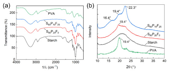 There are no obvious diffraction peaks on the XRD curve of starch film (S100P0F0, Figure 3b), which means the S100P0F0 film contains few crystalline regions. A sharp diffraction peak at 19.4° was observed on the curve of PVA (Figure 3b), and it grew stronger in composite films as increasing amount of PVA blended (Figure S3). This is assigned to (101) crystal plain of PVA. According to previous studies, this diffraction peak of PVA results from the strong intra- and intermolecular hydrogen bonding of PVA molecule chains [40,41]. More obvious diffraction peaks could be observed due to the further addition of fiber which has more crystalline structure. The peaks at 16.4° and 22.3° on S60P15F25 film curve in Figure 3b are assigned to (101), (10ī), and (002) crystal faces of cellulose I crystalline structure [42]. The diffraction peak at 34°, assigned to (040) crystal face, was distinguished in the high fiber content films (S53P13F33 and S57P14F29 in Figure S4). In general, introduction of PVA and fiber raised crystallinity of composite films, which was consistent with former researches.