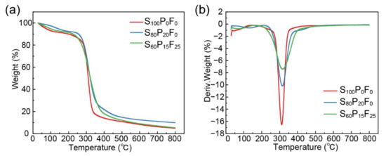 The thermal properties of SPF films were evaluated by TGA and the results were displayed in Figure 4. The weight loss of starch film (S100P0F0) mainly occurred in two stages (Figure 4a). The first stage ended at 250 °C was assigned to the elimination of free water, glycerol, bound water, and volatile products. Then, 70% of total weight loss occurred in the second stage ranging from 250 °C to 400 °C, which was caused by degradation of starch network, including the dehydration of carbohydrate chains and the break of glycosidic bonds [43].