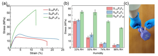 The influence of PVA and fiber on mechanical properties of SPF films is revealed in Figure 5, Figures S5 and S6. The results showed that the addition of PVA simultaneously increased stress and elongation at break of the composite film, and the higher PVA content led to the higher stress and elongation (Figure 5a and Figure S5). The tensile strength was further enhanced while elongation was almost halved when introducing fiber into starch-PVA matrix. The fiction between fibers or between fiber and starch-PVA matrix afforded extra force to resist external stress [47]. However, the fiber network inside starch-PVA matrix hindered the free movement of starch/PVA molecular and might impair ductility of composite film. In addition, the fiber content plays a crucial role on mechanical properties as fiber flocculation at the high fiber consistency during film preparation weakened the stress conduction of the composite film, which explains the impaired mechanical performance as long as the fiber content surpassed 25 wt% (Figures S6 and S7) [48]. According to the former study, the fiber network restricts the movement of starch/PVA molecular and reduces the number of free hydroxyls, the invasion of water molecular can be blocked [49]. Hence, after the introduction of fiber, the SPF film preserved high mechanical strength under high humidity circumstances. As shown in Figure 5b, the maximum stress of the S100P0F0 film and S80P20F0 film reduced from over 40 MPa under 33% RH to 15.72 Mpa and 19.8 Mpa under 55% RH, and further reduced to below 10 Mpa under 74% RH and 98% RH. However, the S60P15F25 film whose maximum stress was 55.17 Mpa under 33% RH and 54.42 Mpa under 55% RH possessed maximum stress of 40.14 Mpa at 74% RH and 30.44 Mpa at 98% RH. Hence, the SPF composite films possess excellent adaption to a wider humidity range. An 8LB barbell could be lifted with the SPF film (2 cm wide) easily (Figure 5c).