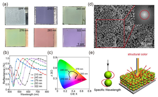 The SPF films exhibit vivid structural colors after the SiO2 NPs/CB dispersion spraying process and PDMS modification. The abundant colors were uniform, bright, and highly saturated, which could cover all over the visible region (Figure 6a). The saturation of the structural colors was enhanced significantly since CB could absorb the incoherent scattered light across the entire visible region. The reflection peaks (reflection spectra in Figure 6b) sticked out at 470 nm, 540 nm, 583 nm, 628 nm, and 705 nm according to the various diameters. The spectra were transferred to more standard Commission Internationale de L’Eclairage (CIE) values (Figure 6c), and the biomimetic colors covered the full-color range which were demonstrated by the reflection and CIE spectra. The arrange characteristics of the amorphous arrays were shown in the SEM image (Figure 6d) and the corresponding fast Fourier transform (FFT) pattern revealed the arrays’ spatial information. A series of symmetrical concentric rings could be observed in the FFT pattern (red circle in Figure 6d), the circular spectra means that the arrangement of the SiO2 NPs is isotropy and with only short-range order. As the schematic illustrates (Figure 6e), the color was produced by the constructive interference of the coherent scattered light, and the scattering light with specific wavelength was determined by the diameter of the several adjacent SiO2 NPs.