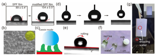 The surface of the composite film modified by SiO2 nanoparticles and PDMS displayed plenty of hydrophobic humps which resembled the micro-structure of lotus leaf surface and endow the composite film super-hydrophobicity (Figure 7b,c). Some air was trapped in the humps of the SiO2/PDMS arrays. The phenomenon fits the Cassie and Baxter model (cosθr = fsolcosθfla − fair) very well which describe the relationship between the CAs of a water droplet on a heterogeneous surface (θh) and flat surface (θfla). In the model, the fsol and fair represent the area proportion of the SiO2/PDMS surface and air contact with the water droplet. The water CAs of the flat (θfla) and the rough SiO2/PDMS surface film (θr) are 110° and 154°. fair is about 0.847, which means the super-hydrophobicity is mainly attributed to the air trapped in the SiO2/PDMS humps and cavities in the rough coating surface. Besides, the modified surface showed extremely low adhesion. A big drop of water (15 μL) was dripped onto the film and the water drop could not wet the surface. There was no residue when the water droplet was pipetted away (Figure 7d) and the sliding angle was only 2° (Figure 7e), which also demonstrates the low adhesion and the super-hydrophobicity of the SPF films. The surface was resisted to the contamination of common liquid in daily life, such as milk and tea (Figure 7f). To demonstrate the practical application of the films, a packing box (inset in Figure 7g) was prepared with the modified SPF films, and the water drops slid quickly without any residual (Figure 7g). The video of the dripping water has been included in the Supplementary Materials.