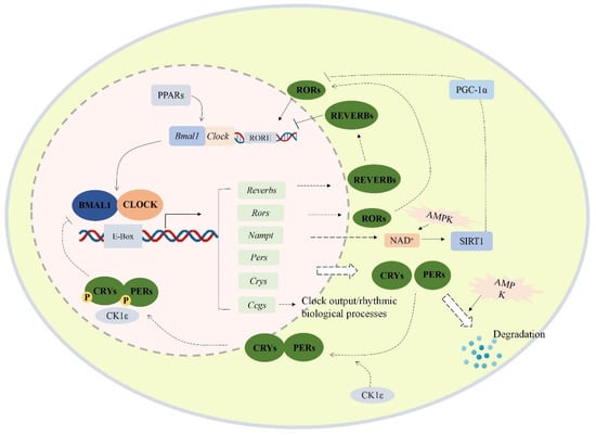 Transcriptional/translational feedback loop of mammalian circadian genes. The cellular circadian system contains an autoregulatory transcriptional/translational feedback loop. PERs/CRYs and CLOCK/BMAL1 loop are the core of the cellular oscillator. CLOCK and BMAL1 form heterodimers and translocate into the nucleus, then bind to the E-box response element of the upstream promoter region of the clock control gene to activate the transcription of the target gene. Meanwhile, the PERs and CRYs proteins also form heterodimers and translocate into the nucleus to inhibit the transcription of Clock and Bmal1. Besides, the expression of Nampt, Rev-erbs, Ppars, Ccgs, and Rors is also promoted by CLOCK/BMAL1 heterodimer. Abbreviations: BMAL1 (aryl hydrocarbon receptor nuclear translocator like 1 proteins), Bmal1 (aryl hydrocarbon receptor nuclear translocator like 1), CLOCK (circadian locomotor output cycles kaput proteins), Clock (circadian locomotor output cycles kaput), PERs (period proteins), Pers (period genes 1/2/3), CRYs (cryptochrome proteins), Crys (cryptochrome genes 1/2), RORs (retinoid-related orphan receptors), Reverbs (reverse erythroblastosis virus α/β), Ccgs (other clock-controlled genes), SIRT1 (silent information regulator 1), Nampt (nicotinamide phosphoribosyltransferase gene), RORE (ROR response element), PGC-1α (proliferator-activated receptor gamma coactivator 1-α), AMPK (AMP-activated protein kinase), PPARs (peroxisome proliferator-activated receptors).
