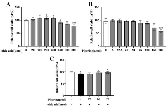 HepG2 cells were incubated overnight in 96-well plates at a density of 1 × 106 cells/well. The cells were cultured with OA and PIP at different concentrations for 24 h. Subsequently, the final concentration of 0.5 mg/mL MTT was added and incubated at 37 °C for 4 h. After removing the MTT from each well, the insoluble formazan crystals were dissolved by DMSO, and the absorbance was measured with a microplate reader (PerkinElmer, Waltham, MA, USA) at 490 nm.