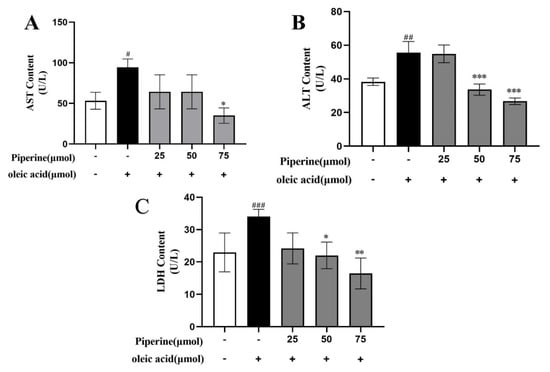 To evaluate the protective effects of PIP on OA-induced hepatotoxicity in HepG2 cells, the levels of ALT, AST, and LDH were examined. As the notable signs of cellular damage and integrity of the liver cell membrane, AST, ALT, and LDH were released into the serum when cells were damaged or necrotic []. Compared to the untreated group, OA treatment significantly increased the activities of ALT, AST, and LDH, which indicated that hepatocyte damage was induced by OA. As shown in Figure 3, the addition of PIP (50, 75 μM) decreased the level of ALT from 55.61 ± 6.56 U/L to 33.63 ± 3.32 U/L and 26.67 ± 1.39 U/L (p < 0.01), respectively. PIP (75 μM) treatment also reduced the content of AST (from 94.53 ± 10.16 U/L to 35.05 ± 9.39 U/L (p < 0.05)) and LDH (from 34.17 ± 2.19 U/L to 16.14 ± 4.77 U/L (p < 0.01)), demonstrating that PIP at 50 and 75 μM could significantly inhibit liver cell damage induced by OA.