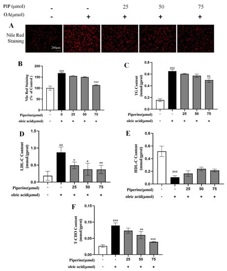 TG, TC, LDL-C, and HDL-C contents in hepatocytes were commonly used to measure the lipid levels []. As presented in Figure 4C–F, OA elevated cellular TG, TC, and LDL-C contents and reduced the level of HDL-C compared to the control group, suggesting that OA disrupted the lipid metabolism homeostasis in HepG2 cells. It was reported that PIP could regulate lipid levels by enhancing cholesterol efflux, reducing cholesterol uptake, and leading to a reversal of hepatic homeostasis induced by HFD []. In our experiment, after PIP treatment, TG, TC, and LDL-C contents were reduced dose-dependent, showing that PIP ameliorated the accumulation of lipids in HepG2 cells.