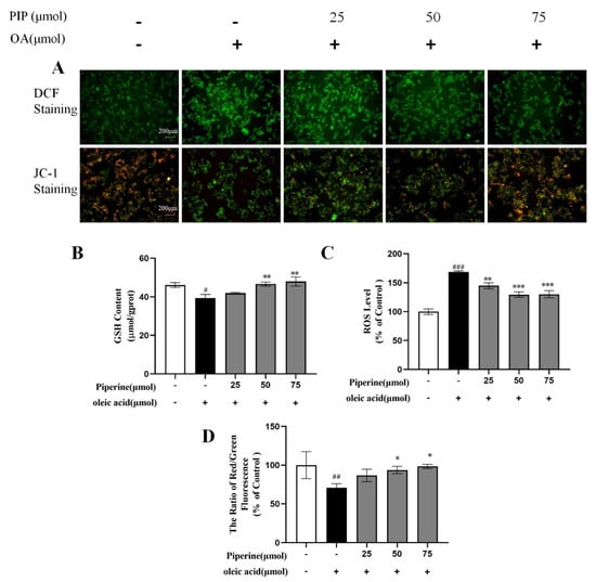 Oxidation of fatty acids mainly occurs in the mitochondria, leading to the production of a considerable amount of ROS []. Studies revealed that oxidative damage could be induced through the overgeneration of ROS and reducing cellular GSH levels, consequently resulting in lipid accumulation and even cell apoptosis [,]. As an important tripeptide reductant that can protect lipid from oxidation and maintain cellular redox status [], GSH level was measured and shown in Figure 5B. The OA-treated cells exhibited a significant decrease in GSH content by 6.75 ± 1.30% compared to control groups, indicating that OA caused oxidative damage in HepG2 cells. After PIP treatment, GSH level was recovered dose-dependently, which suggested that PIP could modulate redox status and prevent oxidative damage in HepG2 cells. The ROS production level measured by fluorochrome dichloroflurorescin diacetate (DCFH-DA) was shown in Figure 5C. After OA treatment, the relative ROS level increased from 100 to 168.81 ± 1.79% (p < 0.001), showing that OA induced the overproduction of ROS in HepG2 cells. Different concentrations of PIP (25, 50, 75 μM) decreased ROS levels to 144.83 ± 5.14, 130.04 ± 4.17, and 129.48 ± 6.13% (p < 0.001), respectively, suggesting that PIP inhibited the ROS overproduction stimulated by OA. These results revealed that PIP supplementation alleviates oxidative damage by reducing the ROS levels and increasing GSH levels of HepG2 cells in a dose-dependent manner.