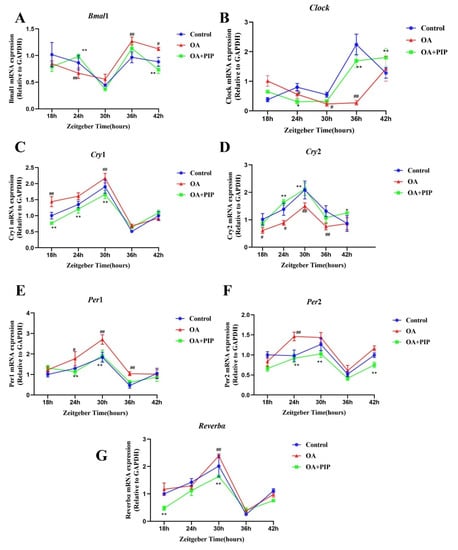 Effects of PIP on OA-induced circadian misalignment. HepG2 cells were treated with OA (400 μM) and PIP (50 μM) for 24 h. Cells then were collected for mRNA analysis at 6 h intervals between 18 h and 42 h time points. (A–G) The mRNA levels of core circadian clock genes Bmal1, Clock, Per1, Per2, Cry1, Cry2, and Reverbα in HepG2 cells. Transcript levels were measured by RT-qPCR and normalized to GAPDH. Results were expressed as the means ± SD, n ≥ 3. # p < 0.05, ## p < 0.01 versus control group, * p < 0.05, ** p < 0.01 versus OA group.