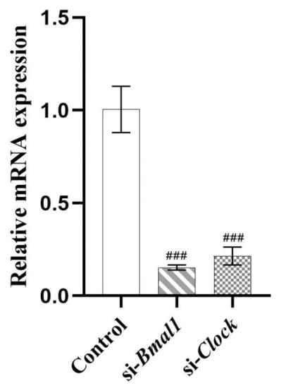 HepG2 cells were transfected with the si-Bmal1/si-Clock using Lipofectamine 2000 transfection reagent. Transcript levels were measured by RT-qPCR and normalized to GAPDH. Results were expressed as the means ± SD, n ≥ 3. ### p < 0.001 versus control group.