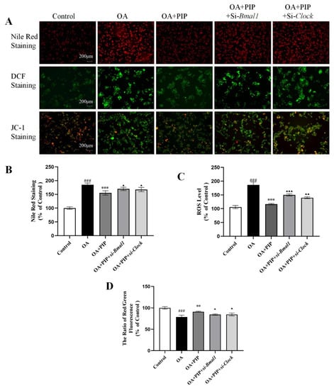 According to Figure 8, the Nile Red staining results indicated that the silencing of Bmal1 or Clock expression inhibited the recovery effect of PIP on lipid accumulation. The intensity of Nile red staining in the OA + PIP-treatment group was 29.60 ± 1.06% (p < 0.001) lower than in the OA group, whereas OA + PIP + si-Bmal1 and OA + PIP + si-Clock-treatment groups showed significant 14.60 ± 1.79% and 12.18 ± 0.10% (p < 0.05) increase compared with the OA + PIP group, demonstrating that PIP treatment could inhibit the OA-disrupted lipid homeostasis, and knockdown of genes Bmal1 and Clock suppressed this alleviation effect of PIP. As shown in Figure 8C,D, after the knockdown of Bmal1 or Clock gene, the ROS level was increased from 116.31 ± 2.77% in the OA + PIP-treatment group to 149.99 ± 3.87% (p < 0.05) and 139.65 ± 3.81% (p < 0.001) in the OA + PIP + si-Bmal1 and OA + PIP + si-Clock-treatment groups respectively. Similarly, the MMP was decreased from 90.99 ± 1.20% in the OA + PIP group to 84.48 ± 1.61% and 85.56 ± 3.32% (p < 0.01) in the OA + PIP + si-Bmal1 and OA + PIP + si-Clock groups respectively. These results indicated that PIP regulated the intracellular redox imbalance and mitochondrial dysfunction via modulating the expressions of the circadian clock genes Bmal1 and Clock.