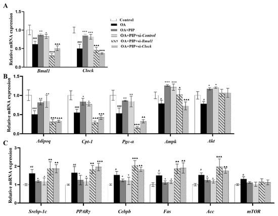 PIP ameliorated OA-induced lipid-metabolism disorder by regulating the circadian clock and lipid metabolism-related factors in mRNA levels. HepG2 cells were transfected with the si-Control or si-Bmal1/si-Clock for 24 h, the cultured cells treated with OA (400 μM) and PIP (50 μM) for 24 h. GAPDH was used as a loading control. (A) The mRNA levels of Bmal1 and Clock. (B) The mRNA levels of Adipoq, Pgc-1α, Cpt-1, Ampk, and Akt. (C) The mRNA levels of Srebp-1c, Cebpb, Pparγ, Fas, Acc and mTOR. Results were expressed as the means ± SD, n ≥ 3. # p < 0.05, ## p < 0.01 ### p < 0.001 versus control group, * p < 0.05, ** p < 0.01, *** p < 0.001 versus OA group, ▲ p < 0.05, ▲▲ p < 0.01, ▲▲▲ p < 0.001 versus OA + PIP group.