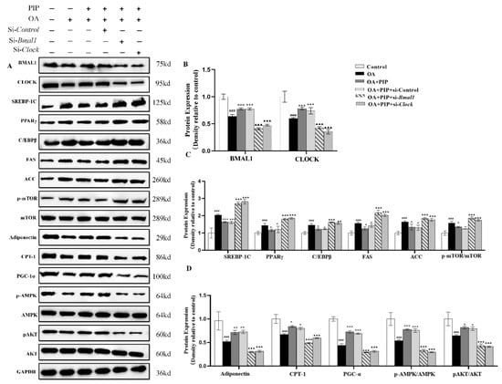The protein expression levels of circadian clock genes and lipid metabolism-related factors were also evaluated by western blot. As a central controller of cell growth and proliferation, mTOR could serve with AMPK and AKT as signaling pathways for regulating cellular metabolism, energy homeostasis, and cell growth []. Ramanathan et al. also reported a key role of AMPK and mTOR in regulating the rhythmic expression of the core circadian clock genes in the SCN [,]. As presented in Figure 10A,D, OA decreased the phosphorylated levels of AMPK and AKT, which were elevated by PIP, indicating that the AMPK/AKT signaling pathway is involved in the regulation effect of PIP on lipid homeostasis [,]. The increased phosphorylated level of mTOR by OA was also reduced by PIP, suggesting that PIP attenuated the lipid accumulation by inhibiting the activation of the mTOR signaling pathway []. In the si-Bmal1 and si-Clock groups, the restoring effect of PIP on p-AMPK, p-AKT, and p-mTOR was weakened. The results suggested that PIP may prevent lipid accumulation by activating AMPK/AKT-mTOR signaling in a Bmal1/Clock-dependent manner in HepG2 cells. According to Figure 10, the protein expression levels of circadian clock genes and lipid metabolism-related factors were disrupted in the OA-treated group compared with the control group, but recovered after PIP treatment. This result was consistent with the result in mRNA expression levels, demonstrating that Bmal1 and Clock played an important role in the regulating effect of PIP on OA-induced lipid-metabolism disorders in HepG2 cells.