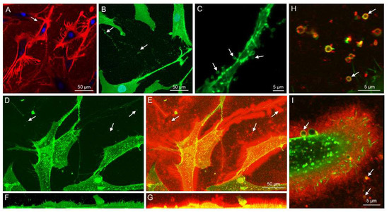 Confocal optical section of live fibroblast-like synoviocytes stained with Alexa Fluor 568-labeled hyaluronan (HA) binding complex (HABC) and NucBlue (pseudocolored red and blue, respectively, panel (A)). Fixed and immunostained cells with CD44 antibody (pseudocolored green) as maximum intensity projection from a stack of images (panel (B)) and the same culture imaged with super-resolution to indicate extracellular vesicle (EV) budding from the membrane of a single cell (panel (C) (maximum intensity projection from a stack of images). Live cells labeled with CellMask Deep Red plasma membrane stain (pseudocolored green, panel (D) and merged with Alexa Fluor-labeled HABC to detect HA (pseudocolored red, panel (E) as maximum intensity projections from a stack of images. The corresponding side views of panels (D) and (E) are shown in panels (F) and (G), respectively. Super-resolution (Airyscan®) optical sections from the same cultures shown in panels (D–G) indicate single EVs of variable size that are attached to the bottom of the culture plate (pseudocolored green, panel (H)) and a more detailed structure of the HA coat around the plasma membrane with budding EVs (pseudocolored red, panel (I)). Arrows in all panels indicate EVs.
