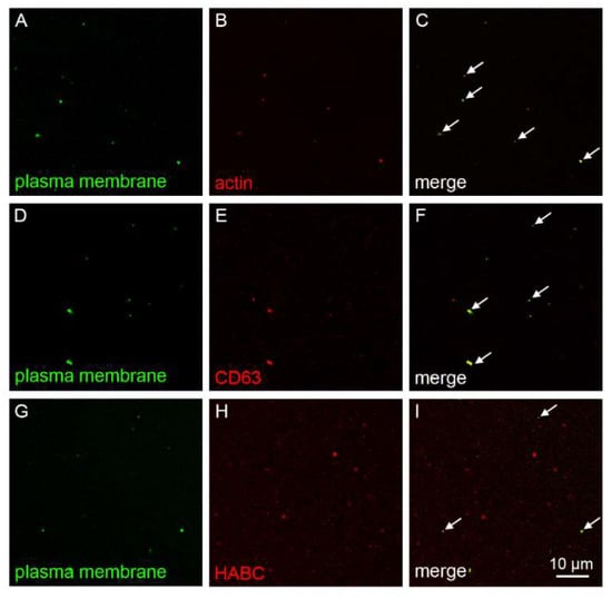 Characterization of extracellular vesicles isolated by ultracentrifugation from fibroblast-like synoviocyte culture medium and stained with CellMask Deep Red plasma membrane stain (pseudocolored green, panels (A,D,G)), combined with Alexa Fluor 594-labeled phalloidin to detect actin (panel (B)), Alexa Fluor 488-labeled CD63 (panel (E)), and Alexa Fluor 568-labeled hyaluronan (HA) binding complex (HABC) to detect HA (panel (H)), all pseudocolored red. Merged images are shown in panels (C,F,I), correspondingly. Arrows in merged images indicate examples of co-localization of the stains.