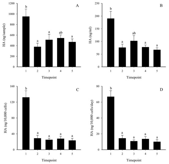 Temporal changes in hyaluronan (HA) concentrations in conditioned medium of fibroblast-like synoviocytes (mean + SE), represented as ng/sample (panel (A)), ng/mL (panel (B)), ng/10,000 cells (panel (C)), and ng/10,000 cells/day (panel (D)). Timepoint 1 = lag phase, timepoints 2–3 = proliferating cells, timepoints 4–5 = high-density cells. Means with dissimilar letters indicate significant differences between timepoints (Kruskal–Wallis ANOVA, p < 0.05).