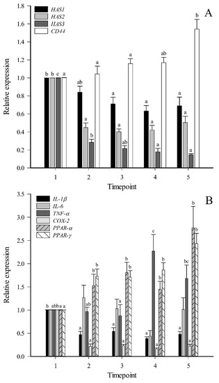 Temporal changes in the expression of selected genes in fibroblast-like synoviocytes (mean + SE). Real-time quantitative PCR was used to determine the ratio of the mRNA expression of the genes of interest relative to the control gene ribosomal protein lateral stalk subunit P0. Panel (A) represents HAS1–3 = hyaluronan synthase 1–3 and CD44 = cluster of differentiation 44. Panel (B) shows IL-1β/6 = interleukin-1β/6, TNF-α = tumor necrosis factor α, COX-2 = cyclooxygenase 2, and PPAR-α/γ = peroxisome proliferator-activated receptor α/γ. Timepoint 1 = lag phase, timepoints 2–3 = proliferating cells, timepoints 4–5 = high-density cells. Means with dissimilar letters indicate significant differences between timepoints (Kruskal–Wallis ANOVA, p < 0.05).