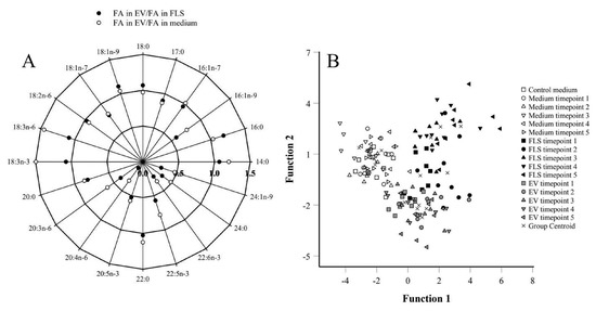 The plot of the fractionation coefficients of selected fatty acids (FAs) in extracellular vesicles (EVs) vs. fibroblast-like synoviocytes (FLSs) (●) or in EVs vs. FLS-conditioned media (○) (panel (A)). Values <1.0 indicate that the mol-% of a given FA is higher in FLSs or media than in EVs and values >1.0 indicate that the mol-% is higher in EVs than in FLSs or media. Discriminant analysis of FA proportions in control and FLS-conditioned media, FLSs, and EVs collected during 5 different timepoints: 1 = lag phase, 2–3 = proliferating cells, 4–5 = high-density cells (panel (B)). Function 1 (on x-axis) explained 58.5% of the variance in the dataset and function 2 (on y-axis) 41.5% of the variance. White symbols = media, black symbols = FLSs, grey symbols = EVs.
