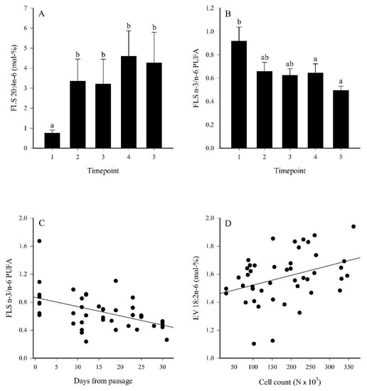 Temporal changes in the proportions of 20:4n-6 (panel (A)) and ratios of n-3/n-6 polyunsaturated fatty acids (PUFAs) (panel (B)) in fibroblast-like synoviocytes (FLSs) (mean + SE), and correlations between n-3/n-6 PUFA ratios in FLSs and the number of days from passage (rs = –0.481, p = 0.001; panel (C)) and between 18:2n-6 proportions in extracellular vesicles (EVs) and FLS counts (rs = 0.342, p = 0.021; panel (D)). Timepoint 1 = lag phase, timepoints 2–3 = proliferating cells, and timepoints 4–5 = high-density cells. Dissimilar letters above bars indicate significant differences between timepoints (Kruskal–Wallis ANOVA, p < 0.05).