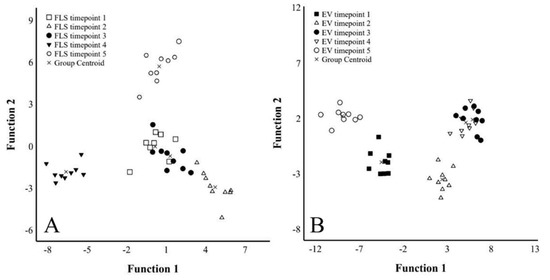 Discriminant analysis of fatty acid proportions in fibroblast-like synoviocytes (FLSs) and extracellular vesicles (EVs) collected during 5 different timepoints: 1 = lag phase, 2–3 = proliferating cells, and 4–5 = high-density cells. (Panel (A)) presents the FLS data, in which function 1 explained 45.1% of the variance in the dataset and function 2 accounted for 29.7% of the variance. (Panel (B)) presents the EV fraction, in which functions 1–2 explained 92.1% of the variance in the dataset.