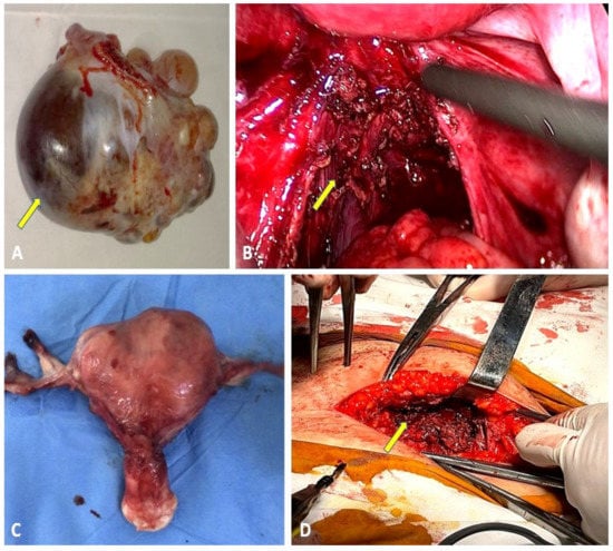 This disease is characterized by lesions that vary in appearance, size, and location. Macroscopically, ectopic endometrial foci may present as superficial “gunpowder burn” lesions on the ovaries or the visceral or parietal serosa. The lesions may be white, red, brown, or blue. They often appear as nodules or small cysts that contain old bleeding areas, surrounded by various degrees of fibrosis. Atypical or “subtle” lesions are common and may occur in the form of red implants (vesicular, polypoid, petechiae, hemorrhagic, “flame-like”) and transparent blisters []. In particular, we can find endometrioma on the ovary, like a cyst with a fibrous wall and a semi-fluid or dense, chocolate-like content. The malignant degeneration should be ruled out when the cyst presents wall nodules or intraluminal polypoid projections []. Deep, nodular infiltrative endometriosis extends >5 mm in the retroperitoneum and may affect uterosacral ligaments, vagina, bladder, ureters, or intestines. The lesions can also take the form of mucous or serous polypoid masses that imitate a neoplastic lesion [].